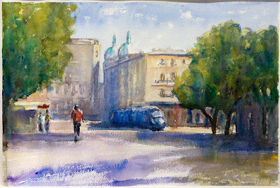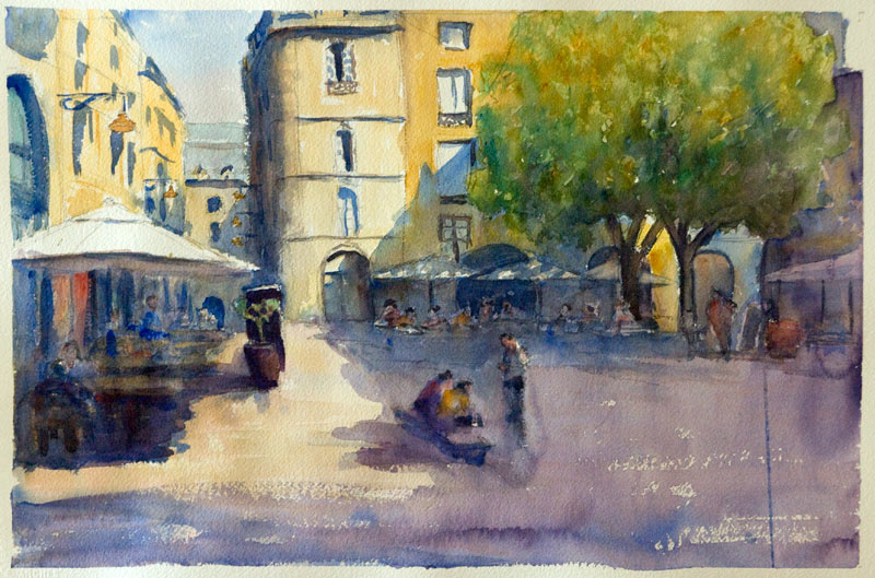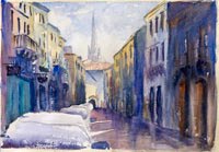 sometimes, watercolour reflects just your state of mind. sometimes not. Ok, all my studies are over overworked, I'm bending the image here then there, I try this, and then go in that direction... pleasant journey for me, but so the colors became muddy, opaque, the notsogoodpaper is tired, sooo tired, and this is why ( with the subject choice, an obscur dead end street deserted, I hope you are aware of more cheerfull ones) this image convey a 'fatigue' feeling. But I enjoyed it, like a child splashing puddlesParfois, l'aquarelle reflete exactement votre etat d'ame. Parfois non. Je surtravaille mes études, je fais des essais sur des essais, je pars a l'aventure je reviens, je m'amuse bien je decouvre j'explore. bien sur, le resultat est mauvais, couleurs opaques, boueuses, mauvais papier tres fatigué, en plus le sujet chiosi, c'est une impasse sombre et deserte... d'ou le leger sentiment de deprime qui se degage de cette aquarelle. Mais je me suis amusé comme un gamin dans les flaques